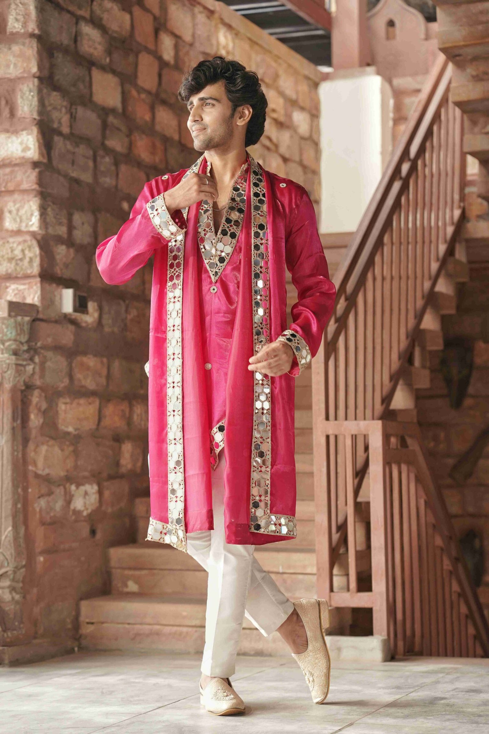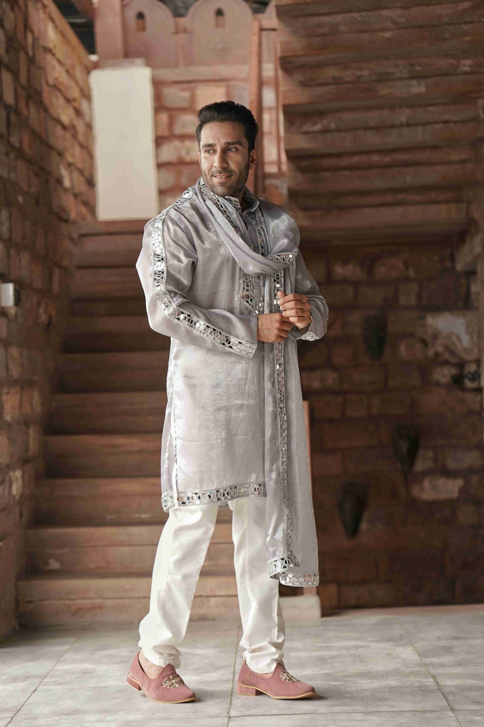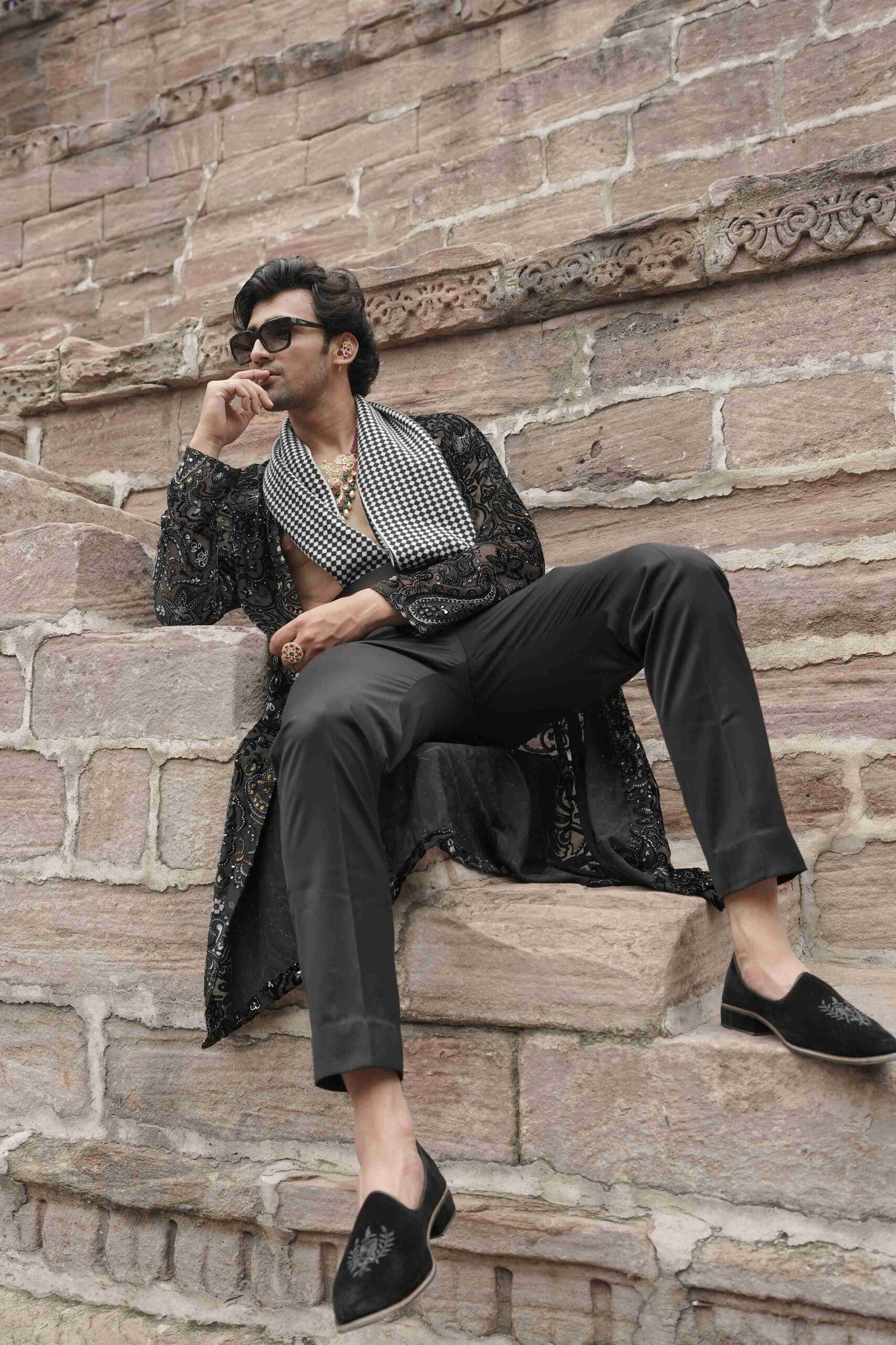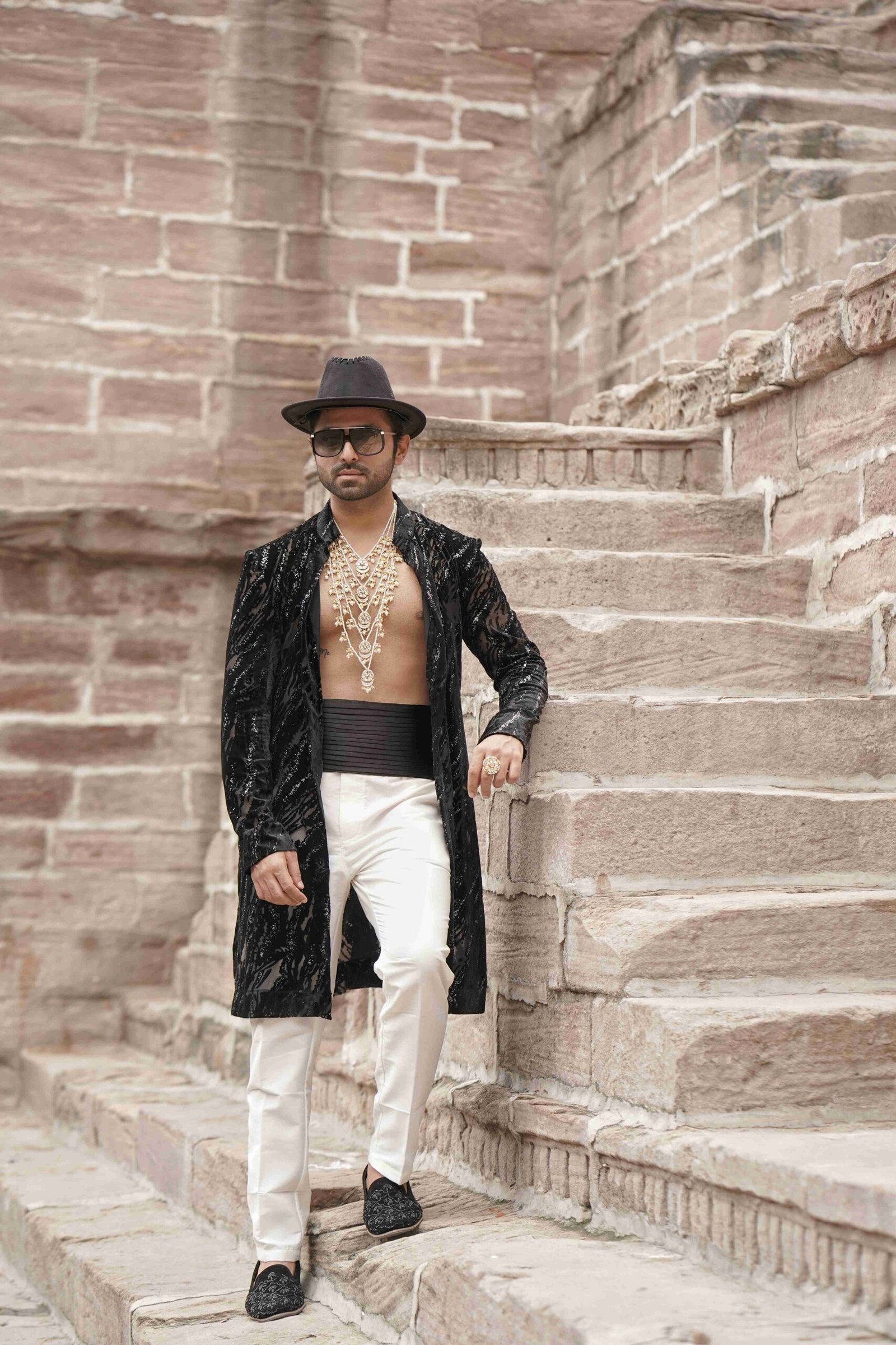Our collection is unparalleled, featuring classic sherwanis, timeless Jodhpuri suits, sharply tailored tuxedos, and regal accessories. Each ensemble is meticulously crafted not only to fit but to redefine your presence.