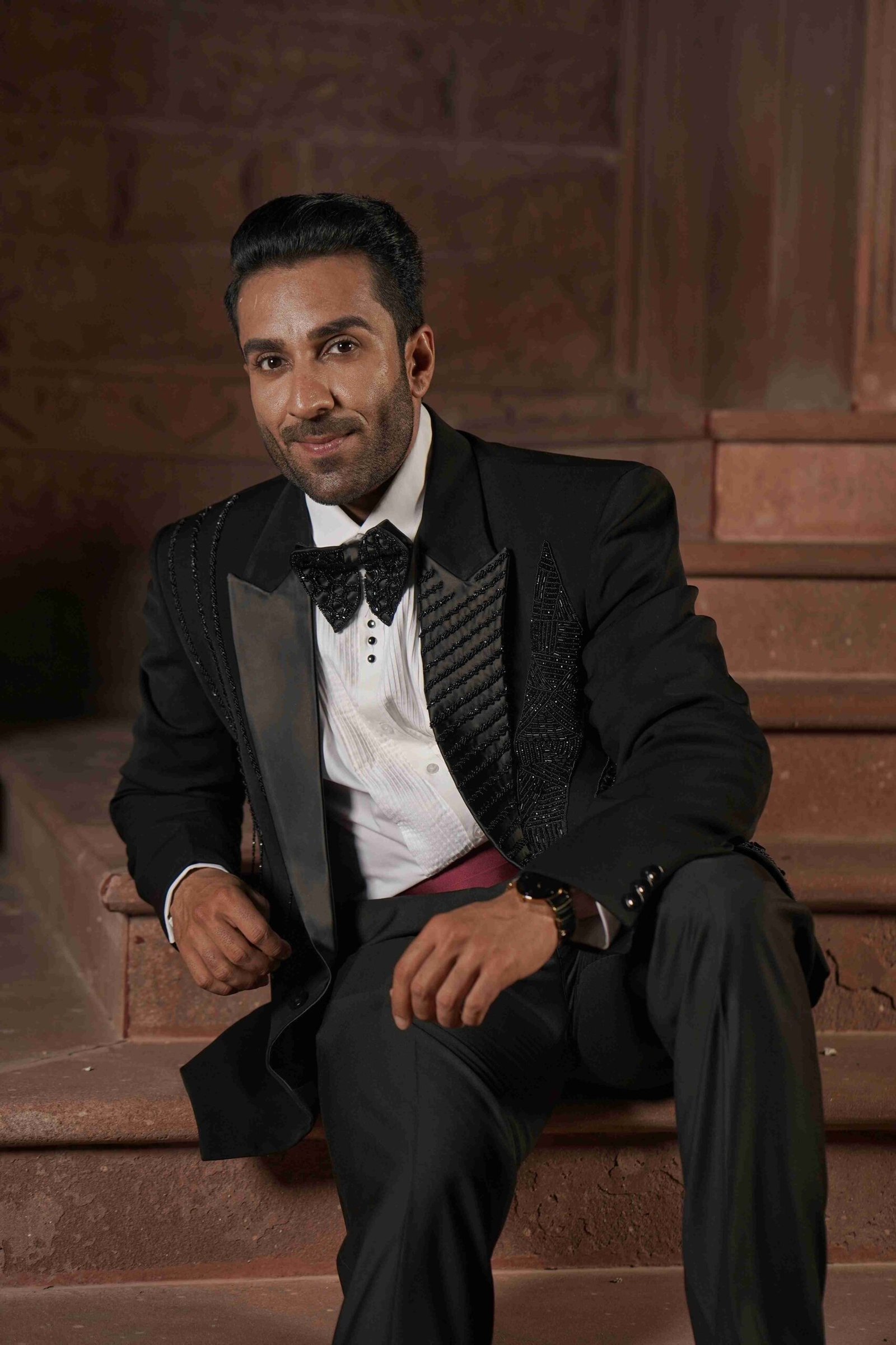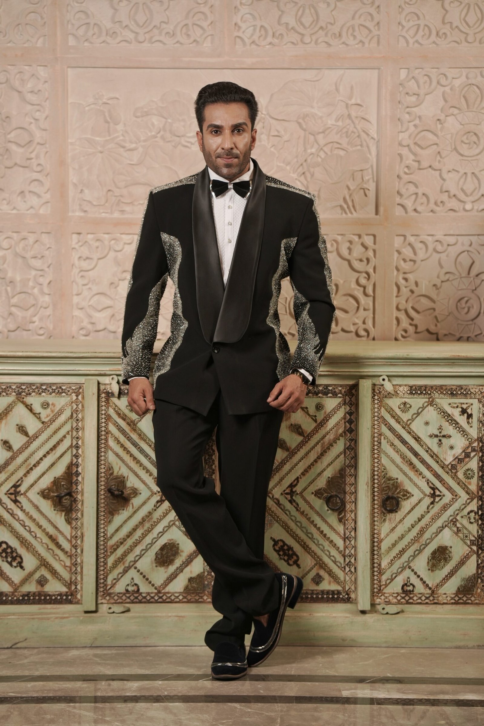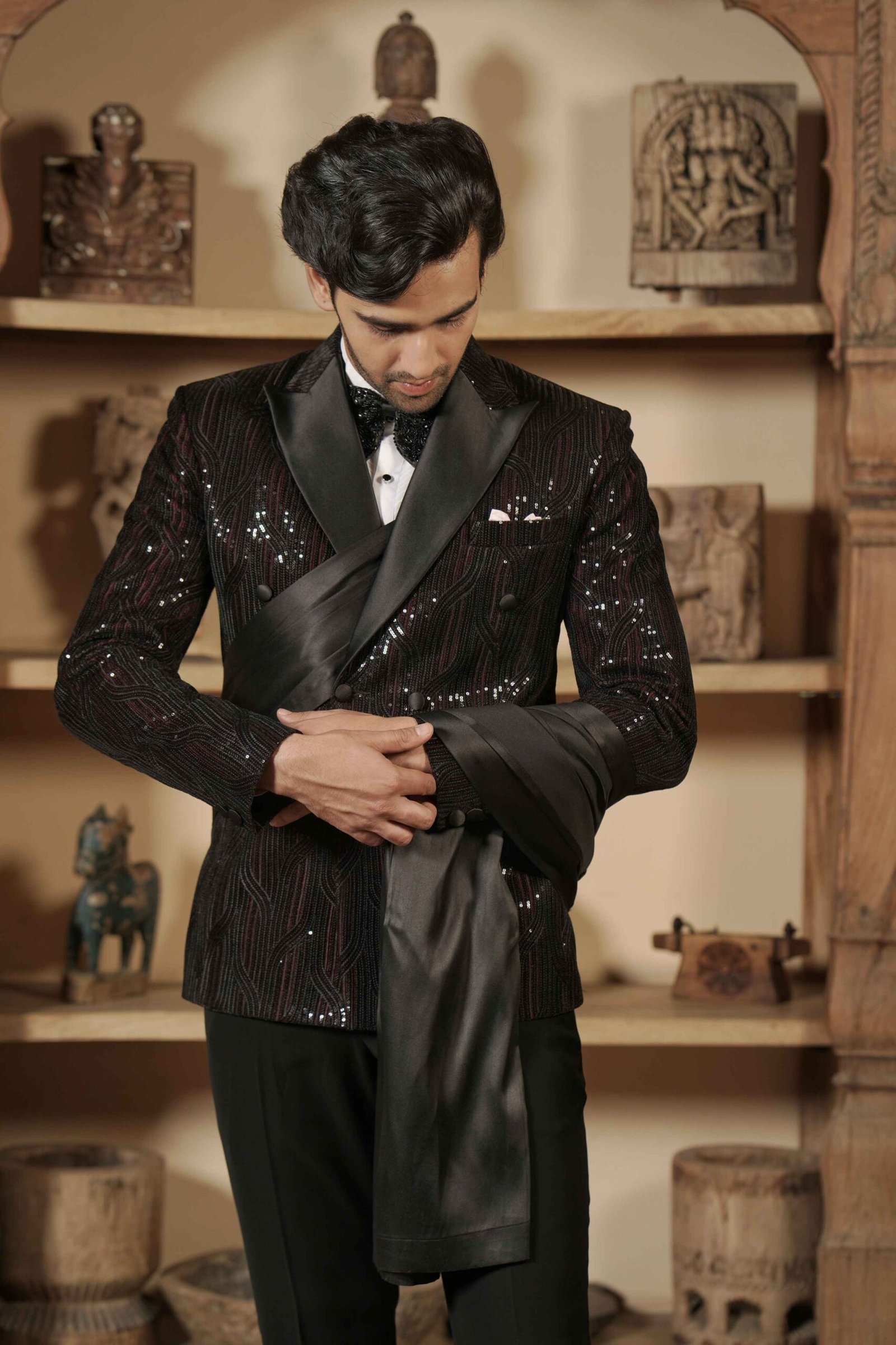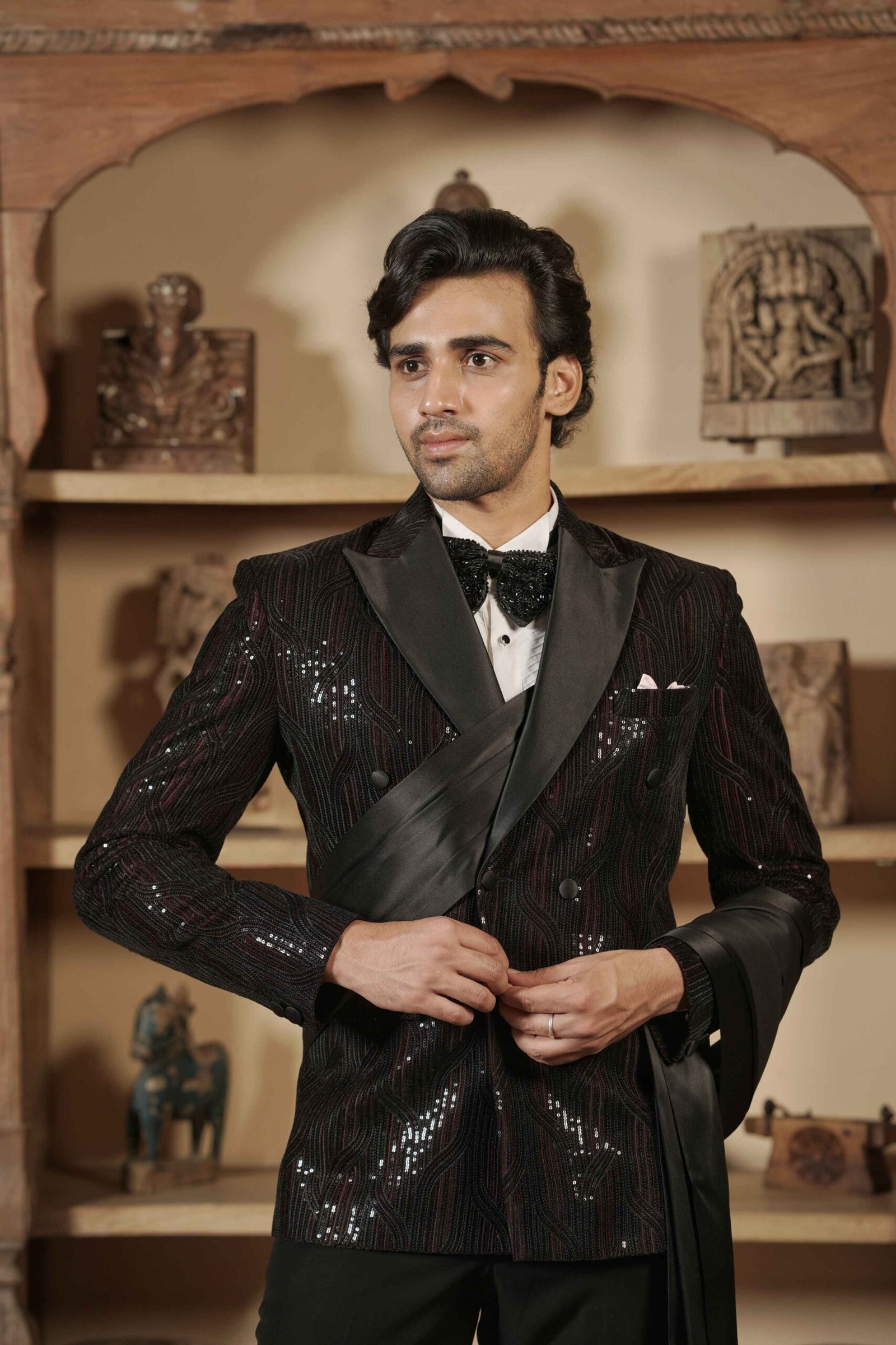 Unveil a presence of absolute grandeur in this magnificent Black Shawl Collar Tuxedo. Crafted from rich lachka fabric, the tuxedo offers a unique texture and sophisticated drape. The elegant shawl collar design is elevated by dazzling crystal work, which is meticulously applied to ensure a brilliant, continuous shimmer. Complete with a coordinated bow tie, this ensemble guarantees a powerful, polished, and brilliantly glamorous presence, making it the ultimate choice for gala dinners and red-carpet events.