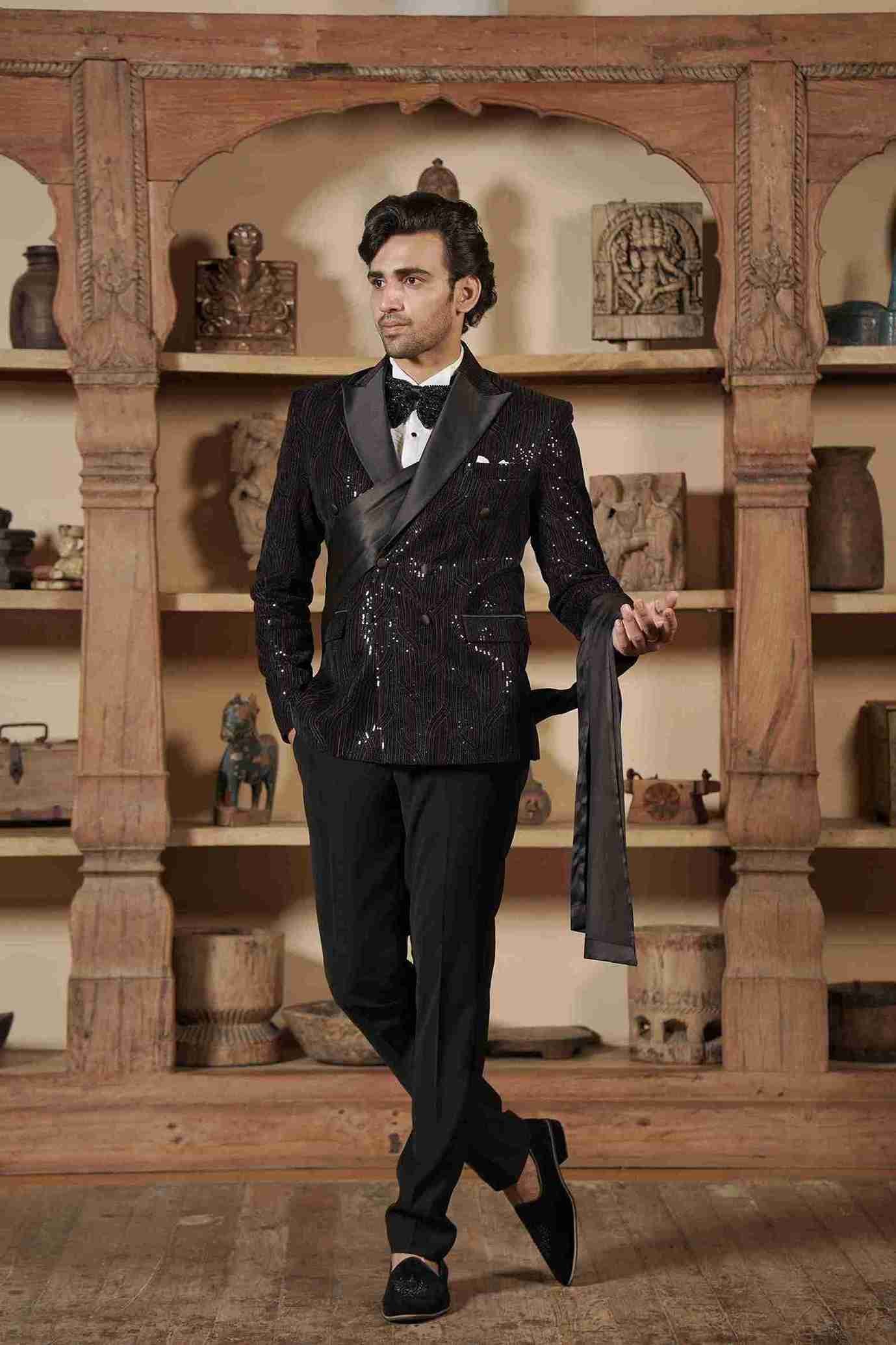 Define your evening look with rich texture in this magnificent Black Tuxedo. The unique lackha fabric provides a sophisticated base, contrasting beautifully with the elaborate handwork. The detailing is meticulous, combining cutdana, sequence, crystals, and thread work to deliver a dense, luxurious shimmer. This comprehensive embellishment ensures that the tuxedo is not just formal wear, but a piece of statement art, guaranteeing a powerful and highly sophisticated presence at any major event.