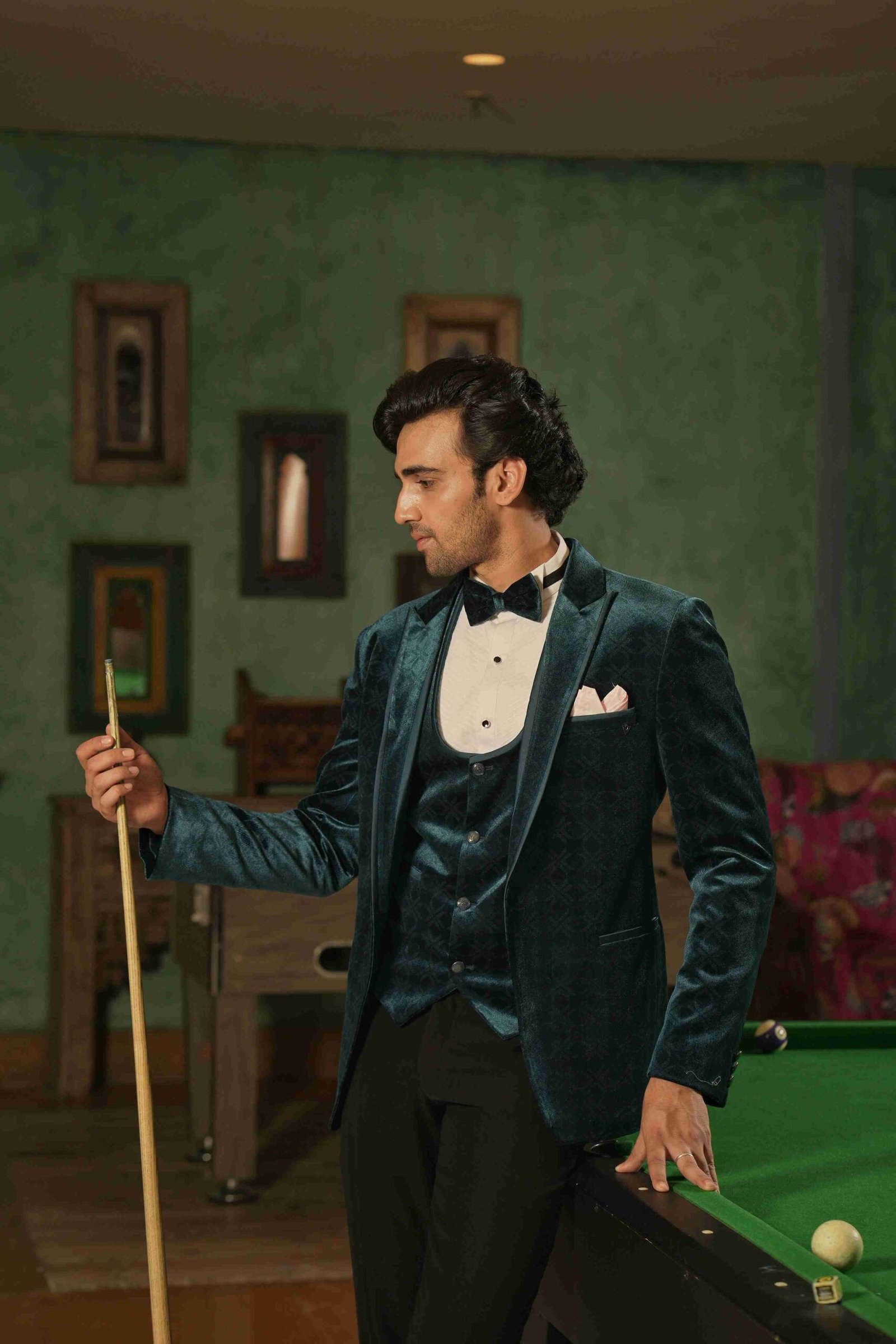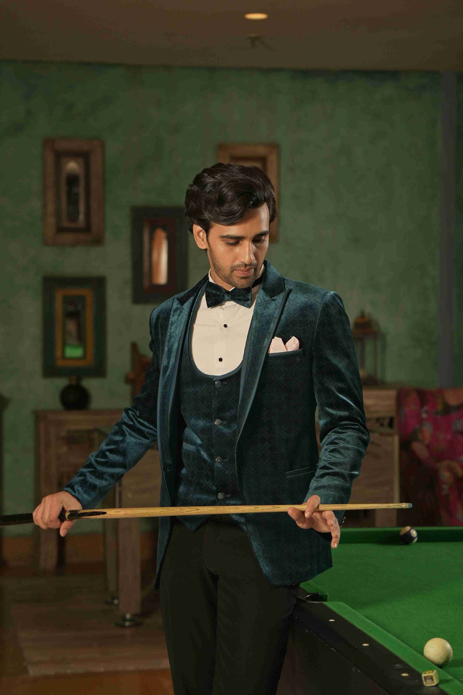 This spectacular Teal Tuxedo set. Tailored from self-textured, shiny velvet fabric, the garment offers a subtle pattern and a remarkable depth of colour that catches the light beautifully. The comprehensive 3-piece structure provides a sleek, tailored, and authoritative formal look. This tuxedo is the ultimate choice for those seeking a unique, luxurious, and unforgettable presence, blending classic structure with a distinctive fabric and hue.