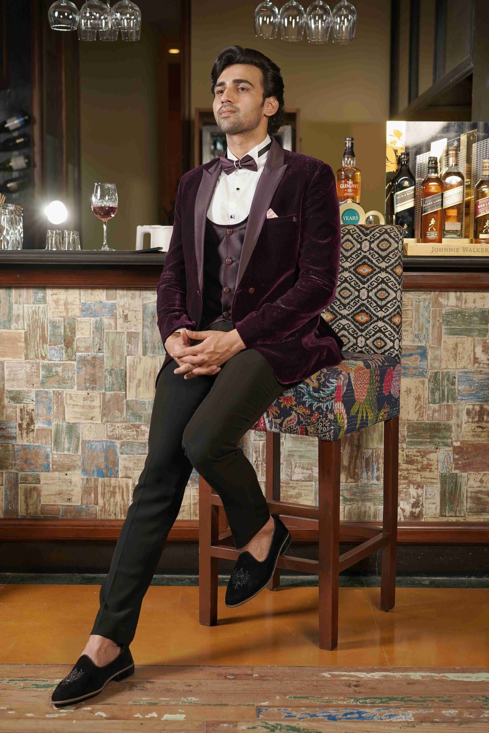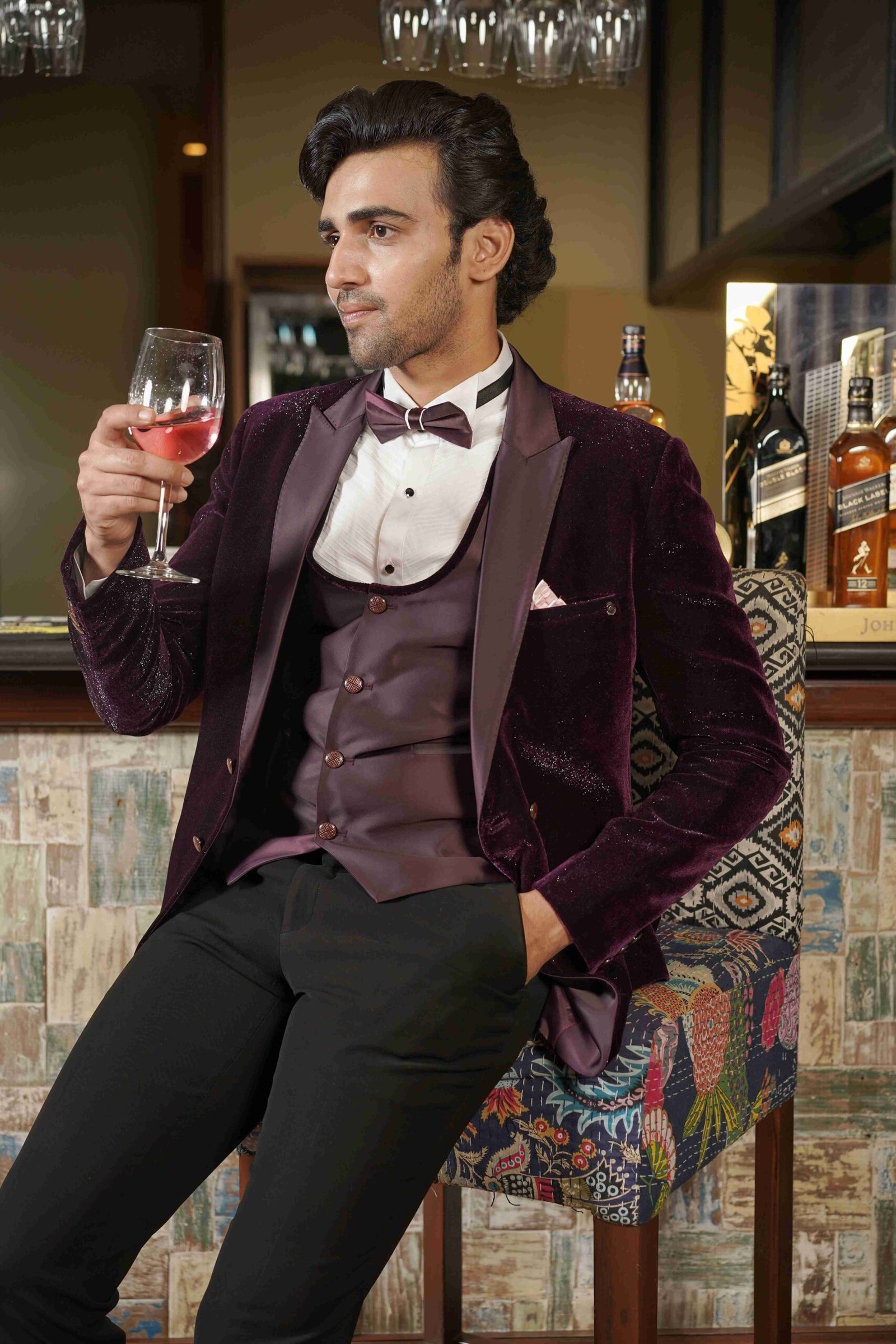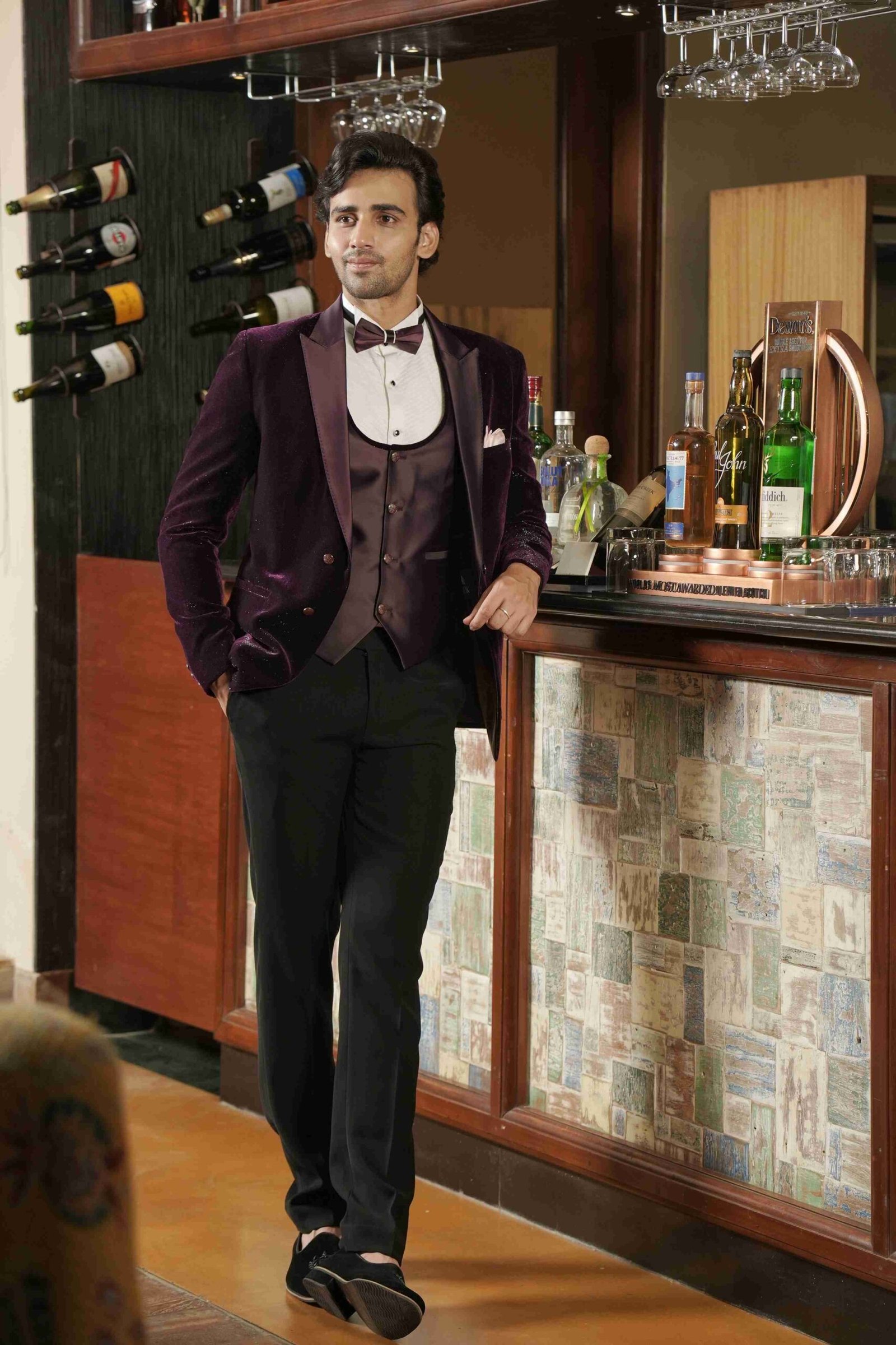 This magnificent Wine Tuxedo set. Tailored from shiny velvet fabric, the deep wine hue catches the light beautifully, promising a truly memorable presence. The comprehensive 3-piece structure provides a sleek, tailored, and authoritative formal look. This tuxedo is the ultimate choice for those seeking a bold alternative to black, combining classic formal structure with a rich material and vibrant colour for unparalleled evening style.
