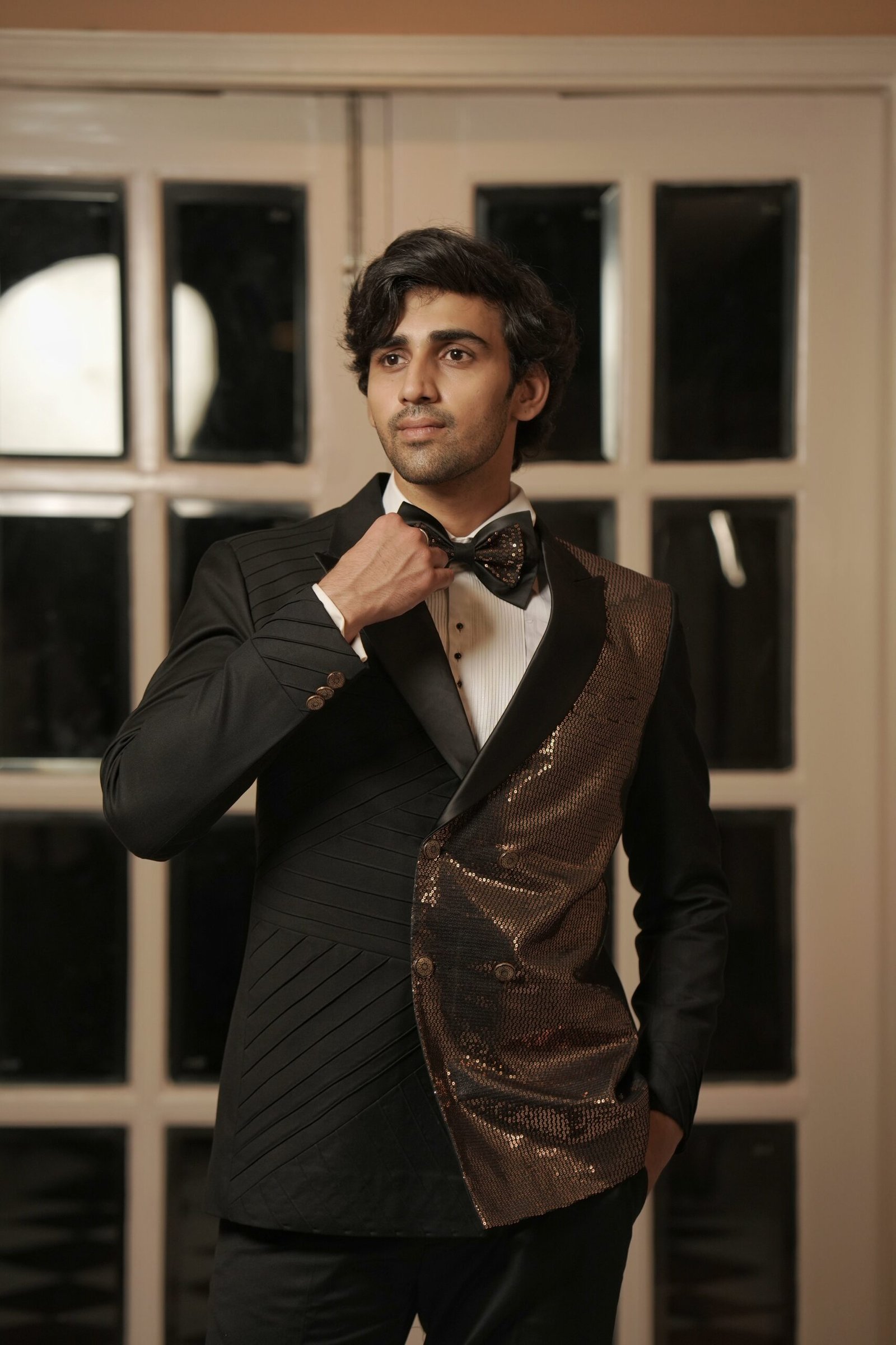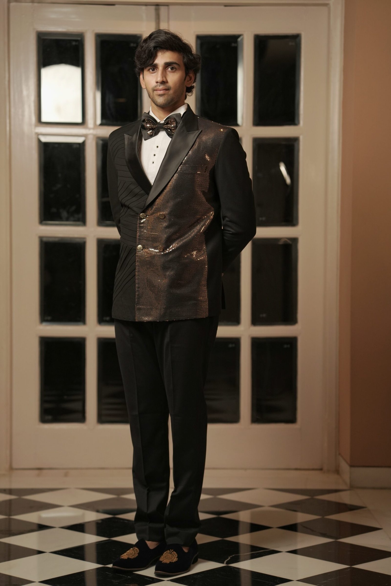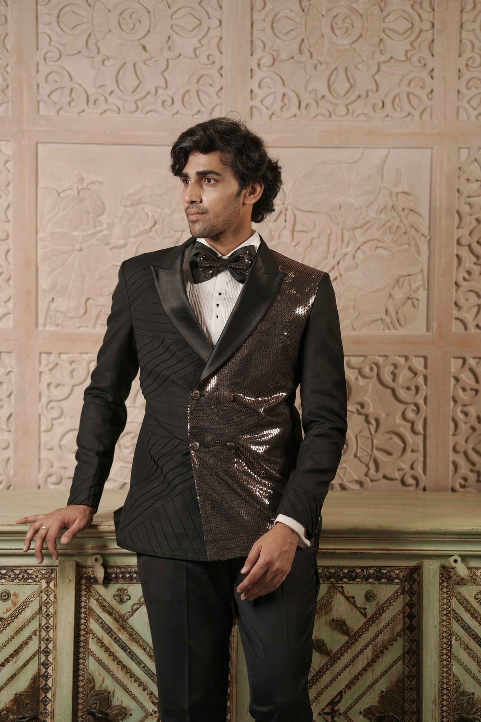 Command the room with impeccable detailing in this striking Black Sequin Tuxedo. The formal 6-button double-breasted silhouette ensures a sharp, powerful fit. The entire piece is richly embellished with sparkling sequin work, contrasted by subtle, sophisticated pin tucks for added dimension. The final touch is a coordinating sequin work bow, providing a cohesive and luxurious finish. This tuxedo promises a powerful, polished, and brilliantly glamorous presence at your most important evening events.