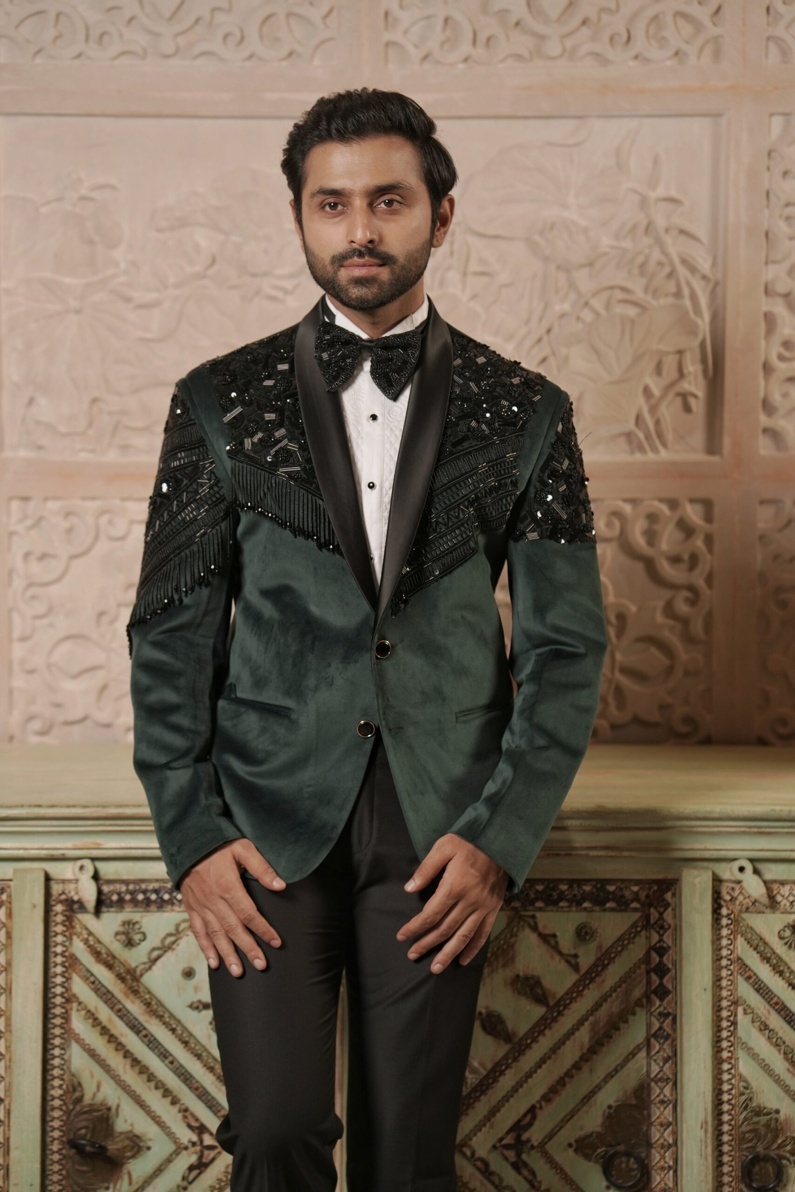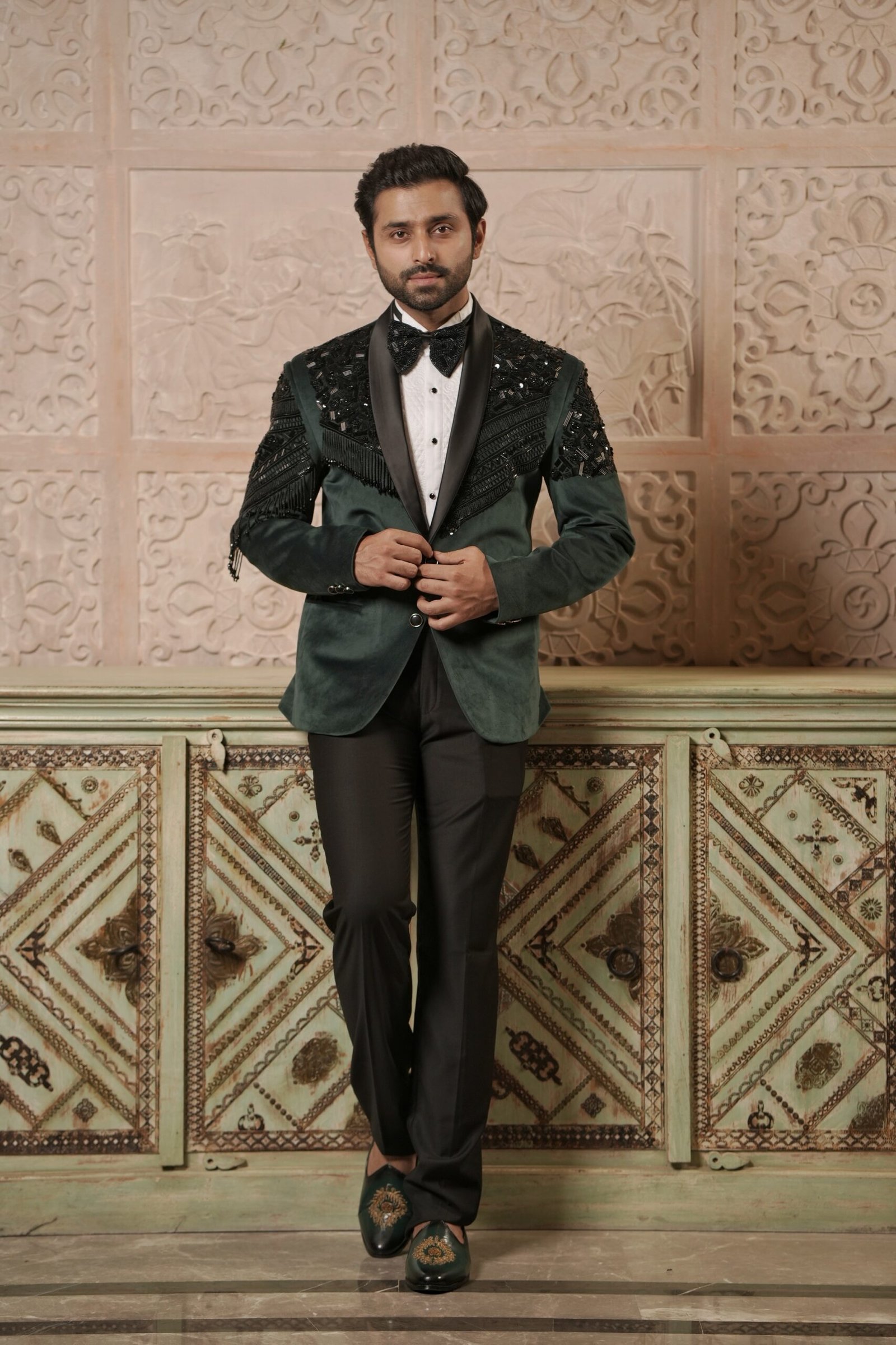 Make a bold, sophisticated statement in this magnificent Green Tuxedo. The formal silhouette is elevated by its rich suede fabric and sharp detailing. The design features a defining contrast from black piping and is lavishly embellished with shimmering cutdana work. Distinctive tassels complete the ensemble, adding movement and an element of high fashion. This tuxedo is an ideal choice for black-tie events, receptions, and parties where you want a truly unique and luxurious presence.